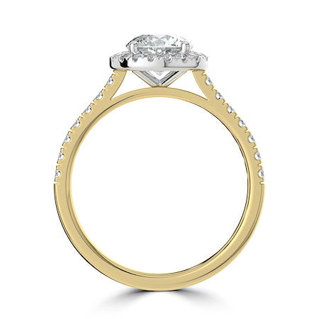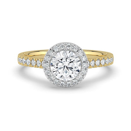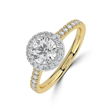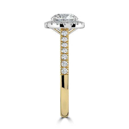 Stunning 18ct Yellow Gold & Platinum round brilliant diamond engagement ring, featuring a diamond set halo and shank. This piece is perfect for those who love all the sparkle!
