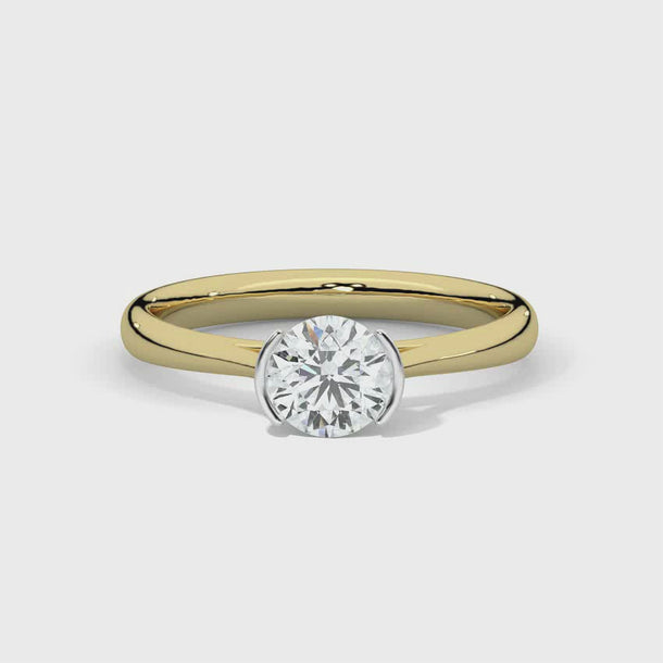 This ultra modern 18ct Yellow Gold & Platinum Round Brilliant Diamond solitaire is set in a smooth half bezel, the design allows you to see the movement and curves of the stone in all its glory.