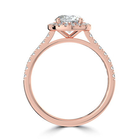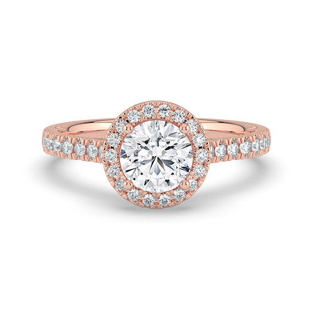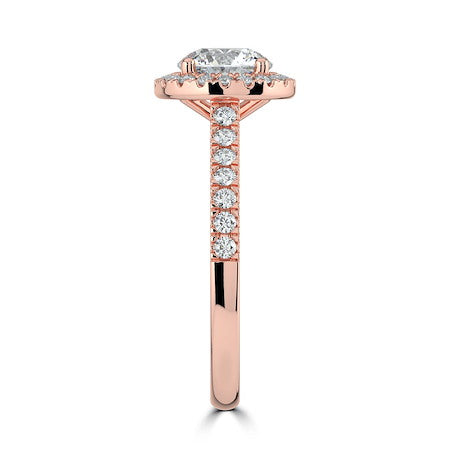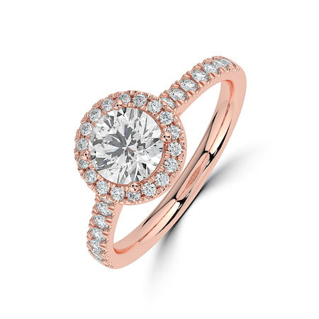 18ct Rose Gold stunning round brilliant diamond engagement ring, featuring a diamond set halo and shank. This piece is perfect for those who love all the sparkle!