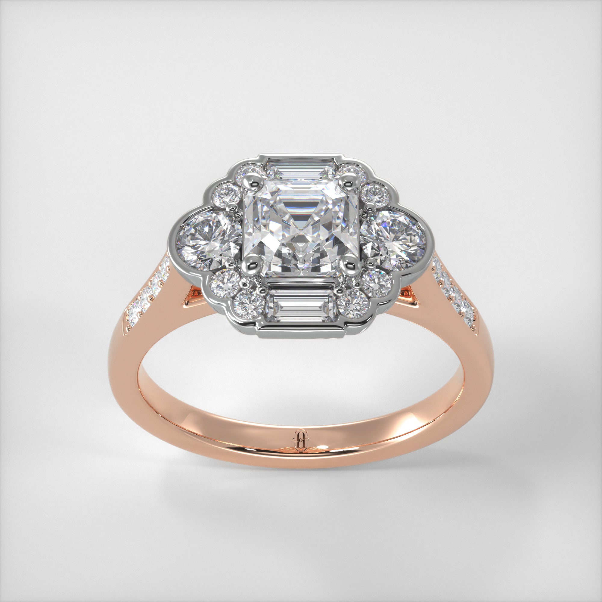 A dazzling ring with a beautiful Art Deco feel, the Tallulah is a favourite of the Alexandra Elizabeth team. Featuring an array of dazzling diamonds this piece has a total of 1.25ct made up of an Asscher, Baguettes and Round Brilliant Diamonds, covering the head and the shank of this ring. It is truly sparkling!