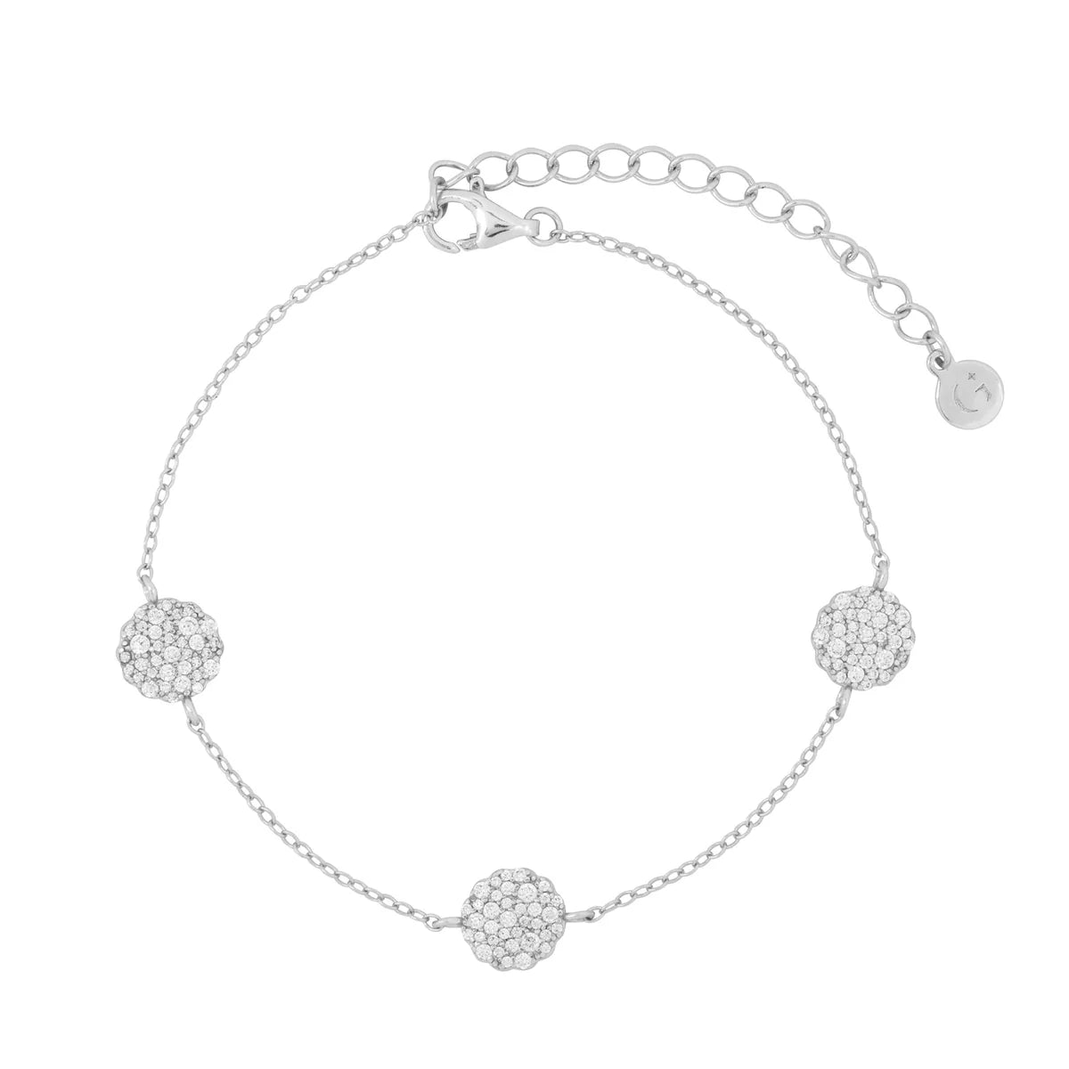 Sparkly, delicate and timeless, the Aurora Bracelet can be styled with any look. Wear it alone or layer it with your other favourite fine bracelets. Beautifully-crafted, featuring three evenly-spaced discs measuring 7mm wide, along a fine link chain measuring 16cm with 4xcm extention. Each disc features an array of super sparkly pavé-set cubic zirconia stones. Fastened with a lobster clasp and featuring an extension chain for versatility in length. Made in sterling silver with a rhodium plating to stop tarnishing and scratching, this long lasting design is perfect for a jewellery collection.