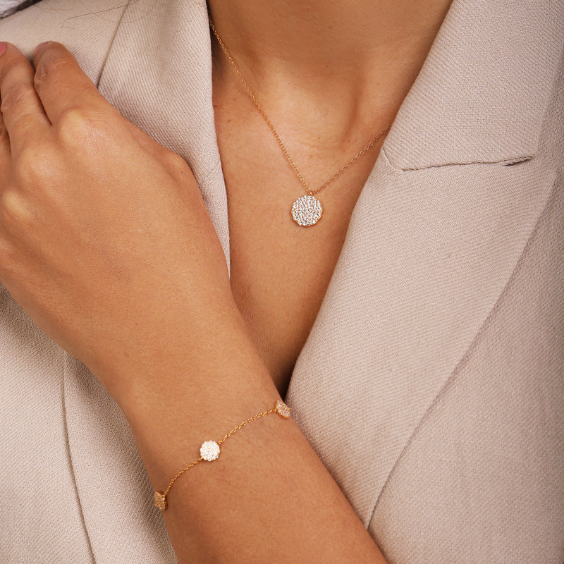 Sparkly, delicate and timeless, the Aurora Bracelet can be styled with any look. Wear it alone or layer it with your other favourite fine bracelets. Beautifully-crafted, featuring three evenly-spaced discs measuring 7mm wide, along a fine link chain measuring 16cm with 4xcm extention. Each disc features an array of super sparkly pavé-set cubic zirconia stones. Fastened with a lobster clasp and featuring an extension chain for versatility in length. Made in sterling Silver, 18ct Gold, this long lasting design is perfect for a jewellery collection.
