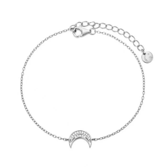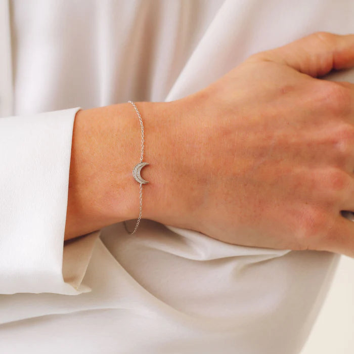 Glow like the night sky with the Celestial Moon Bracelet. Suspended on a delicate chain, this star-shaped charm sparkles with a cluster of glittering pavé-set cubic zirconia. Finished with a lobster clasp and an adjustable extension chain. Made from hypoallergenic 925 sterling silver finishes in rhodium (for a tarnish-resistant silver finish).