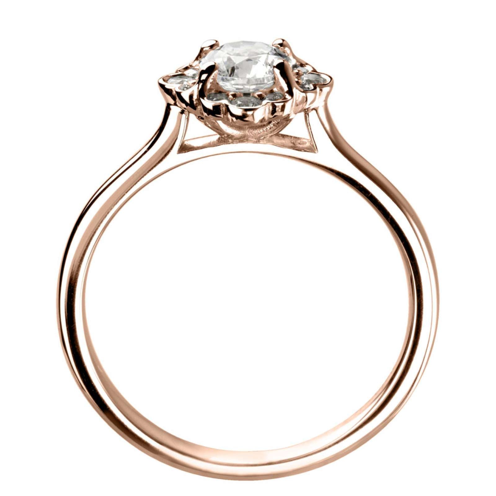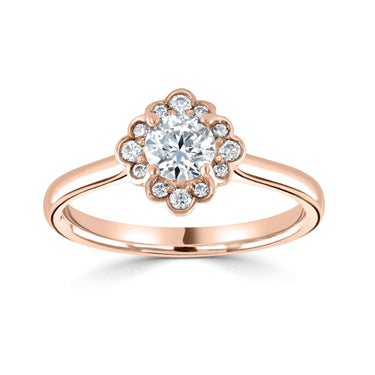 A scalloped edge halo with plain shoulders for a round centre stone. This is made from 18ct Rose Gold with a total stone carat weight of 0.34ct.