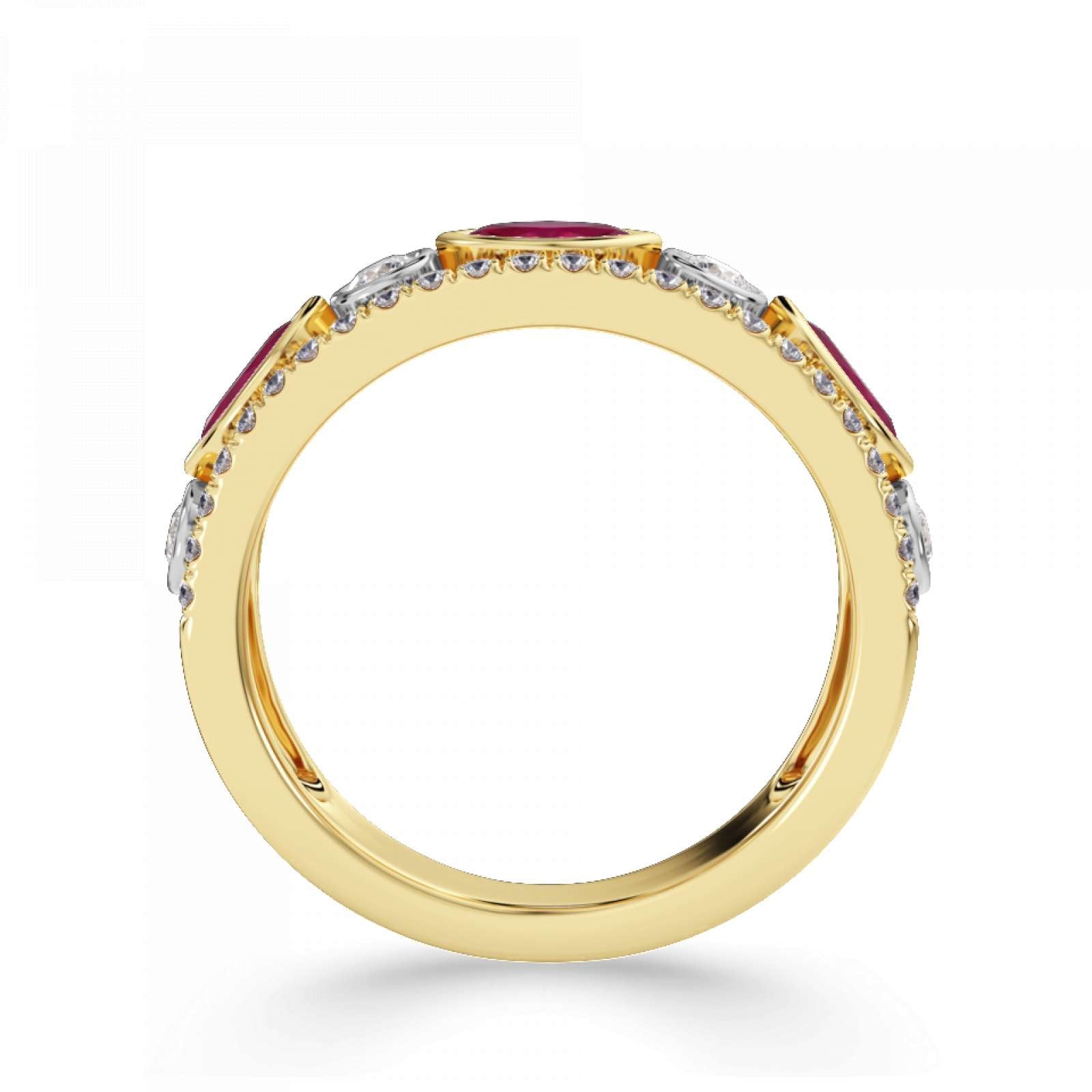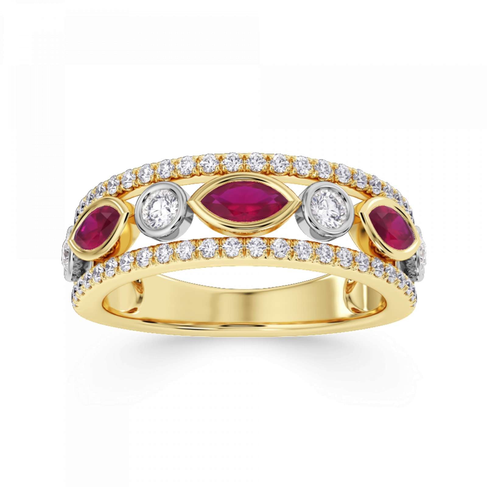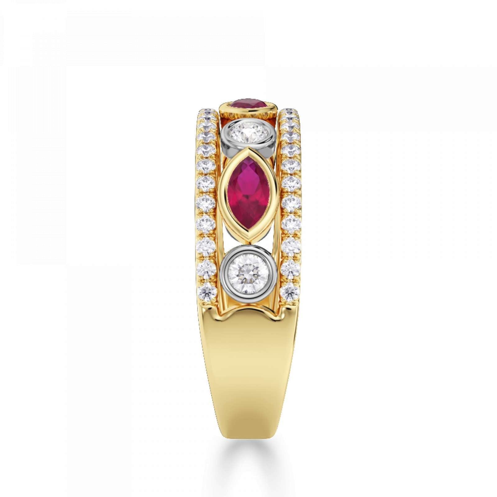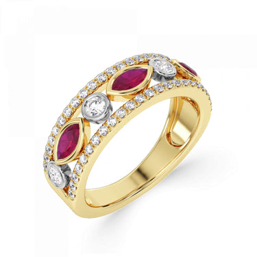 A statement diamond and gemstone ring featuring rubover set marquise and round stones. Available set with ruby, blue sapphire or emerald. This design is beautifully crafted from 18ct Yellow Gold and Platinum