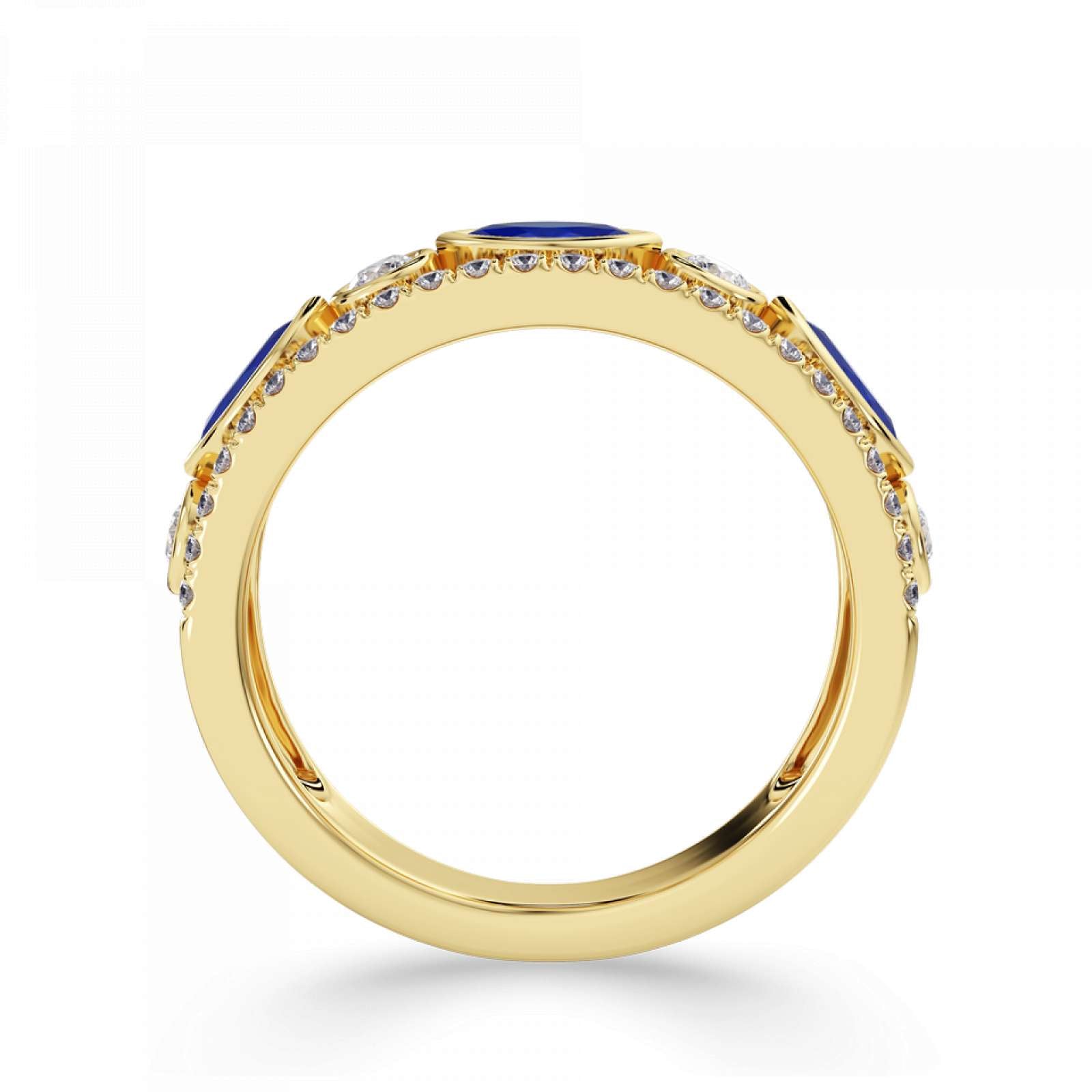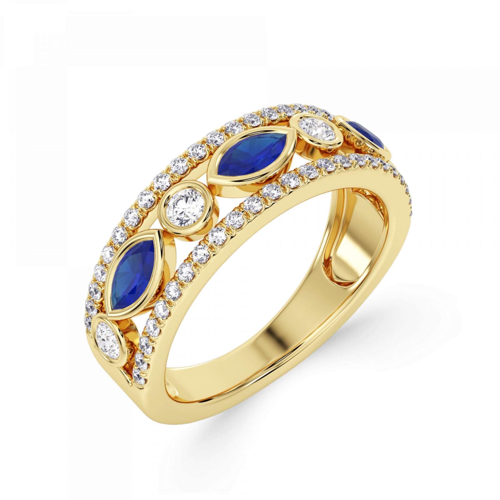 A statement diamond and gemstone ring featuring rubover set marquise and round stones. Available set with blue sapphire, emerald, or ruby. This design is beautifully crafted from 18ct Yellow Gold