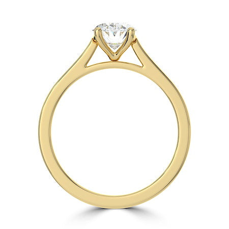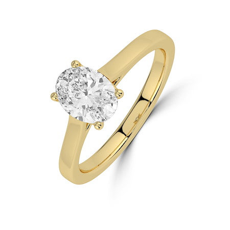 18ct Yellow Gold Oval cut Diamond, set in a classic 4 claw setting with modern slim shank. The elegant open claws show this glittering stone of beautifully. A classic piece perfect for that special question.