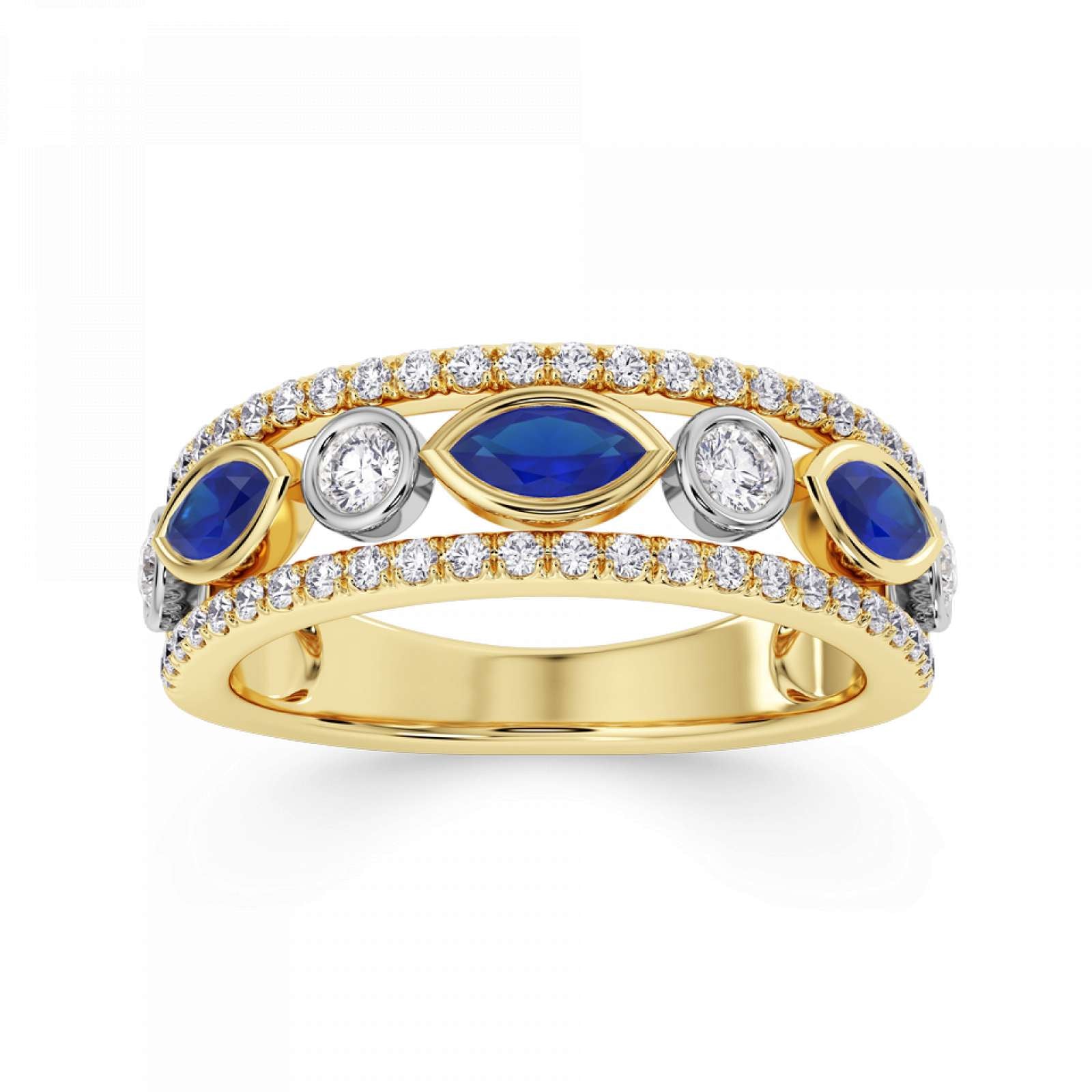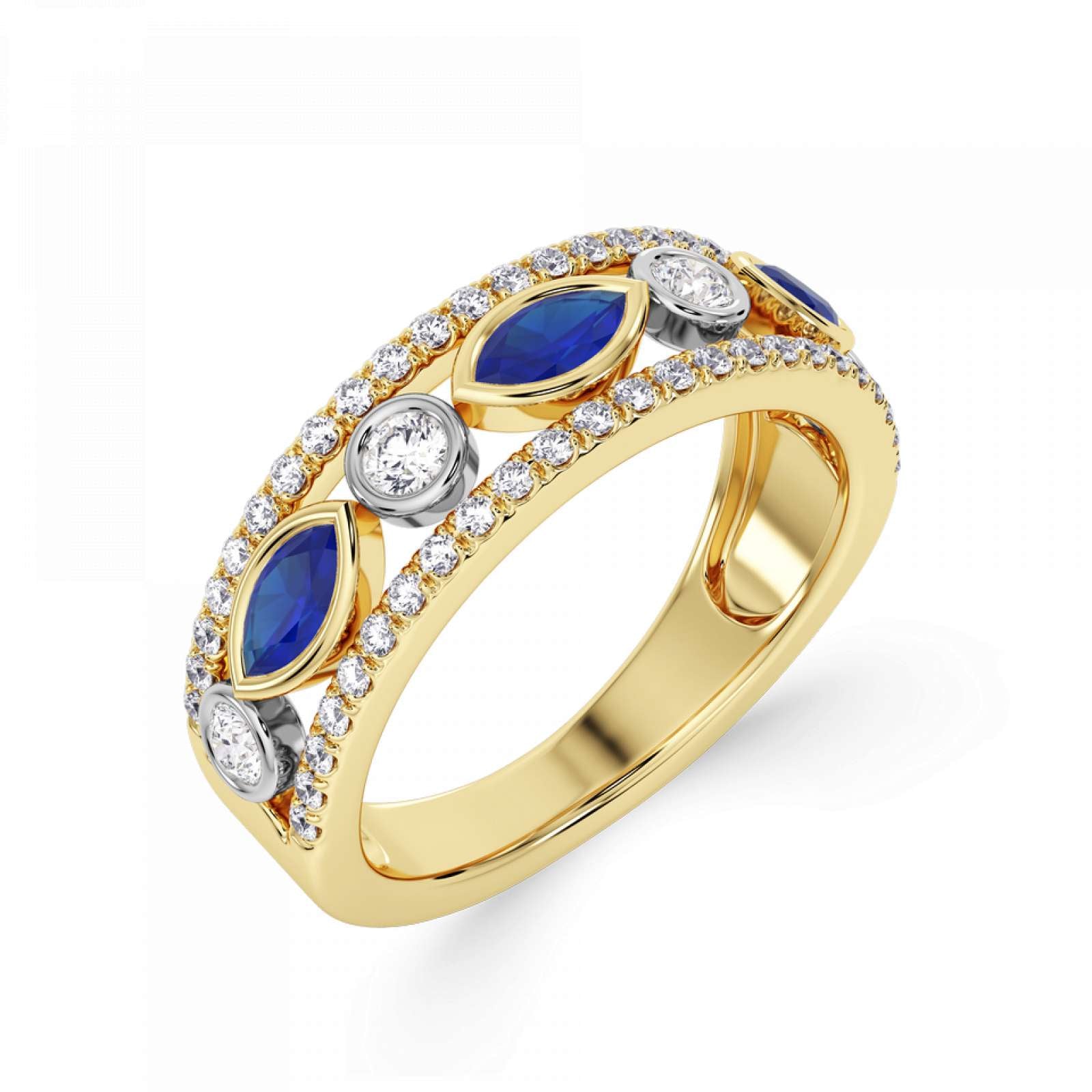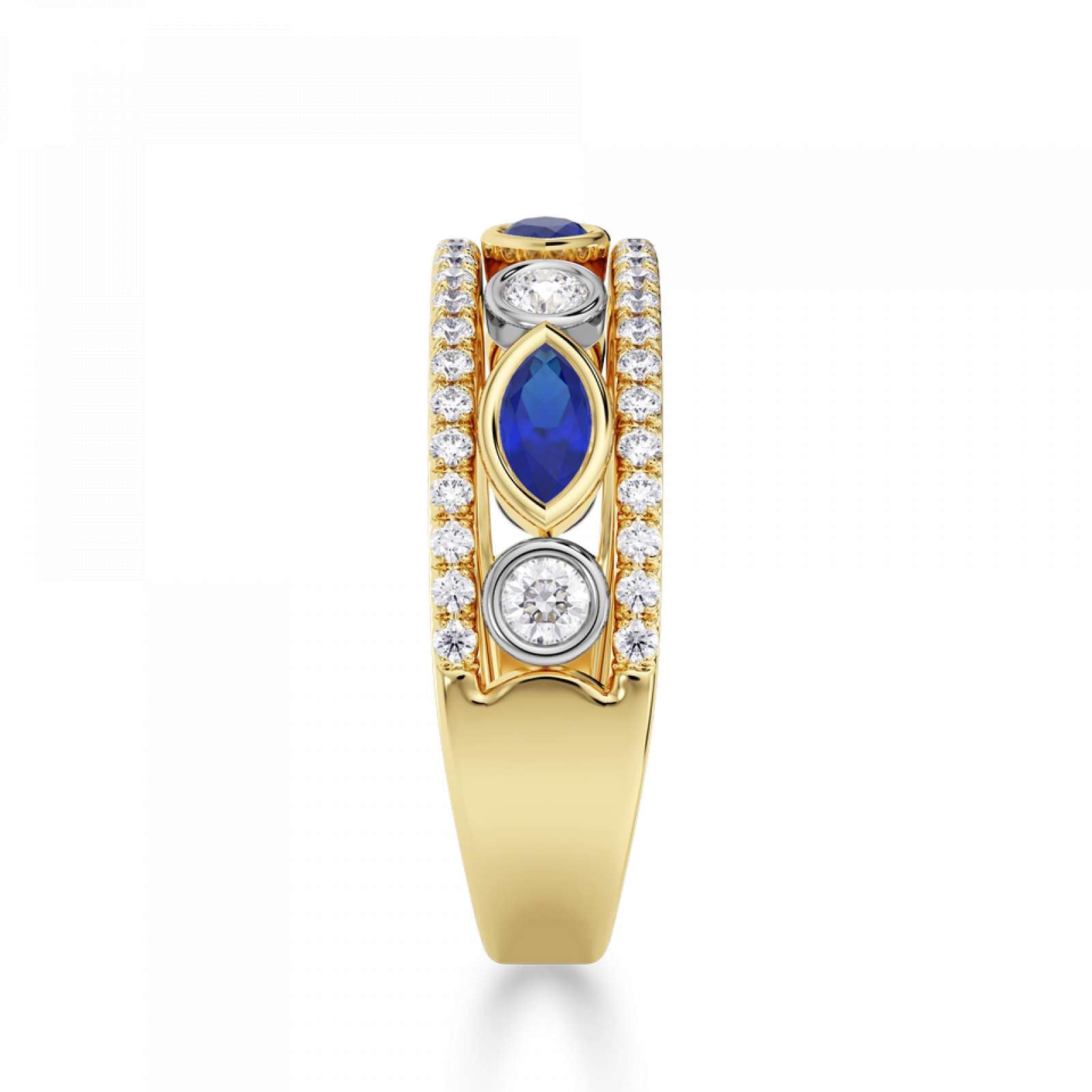 A statement diamond and gemstone ring featuring rubover set marquise and round stones. Available set with blue sapphire, emerald, or ruby. This design is beautifully crafted from 18ct Yellow Gold and Platinum.