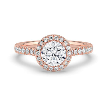 18ct Rose Gold stunning round brilliant diamond engagement ring, featuring a diamond set halo and shank. This piece is perfect for those who love all the sparkle!