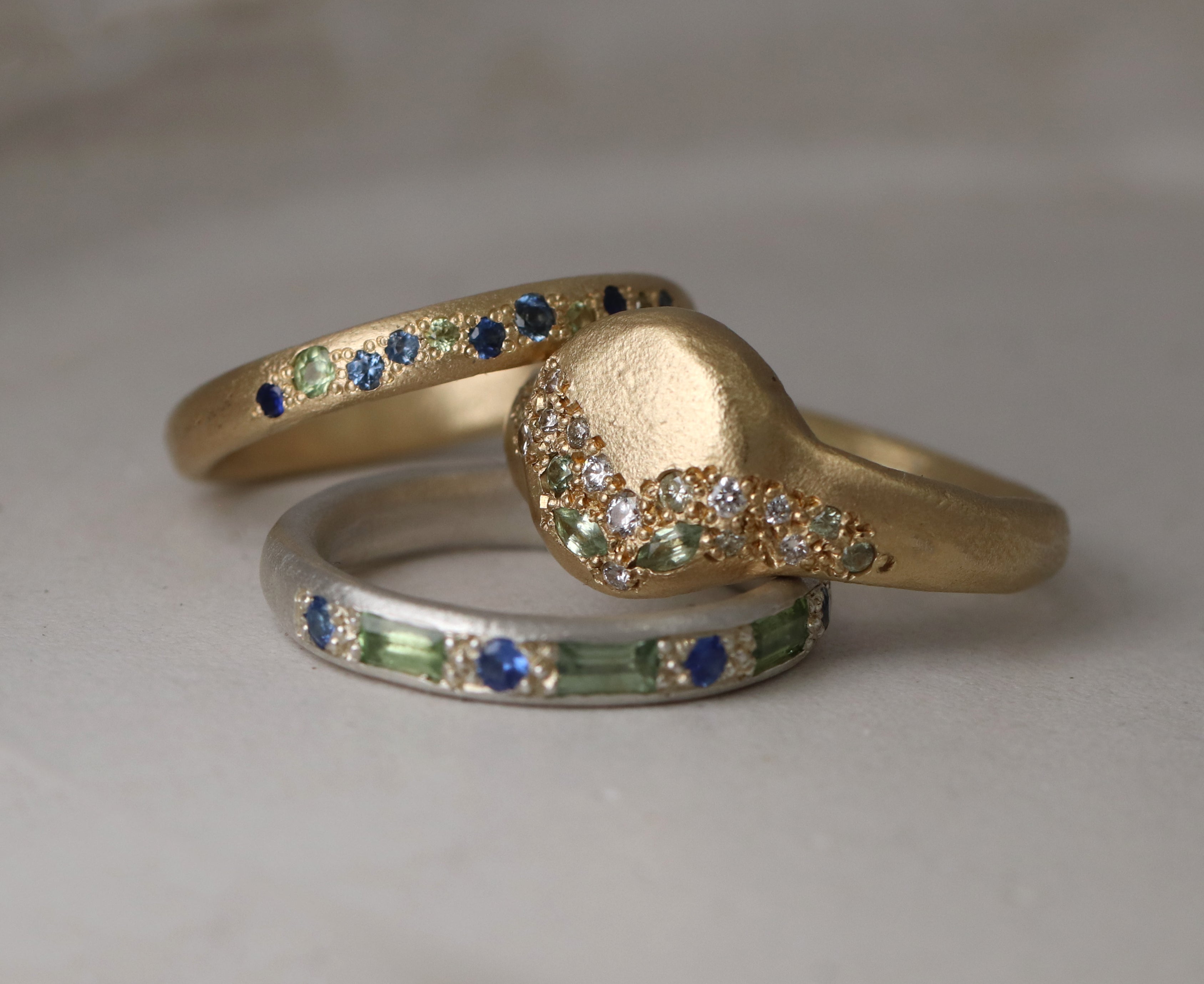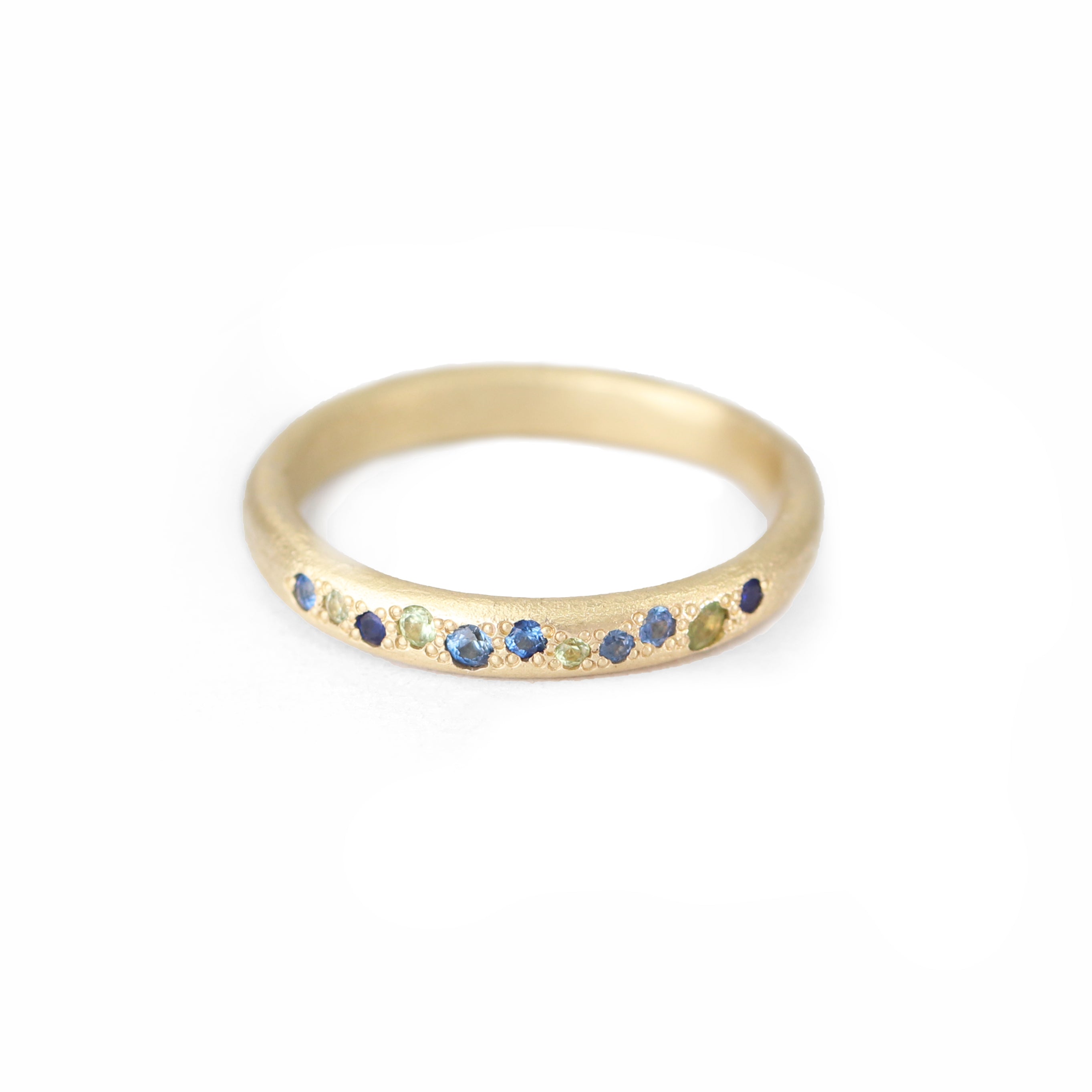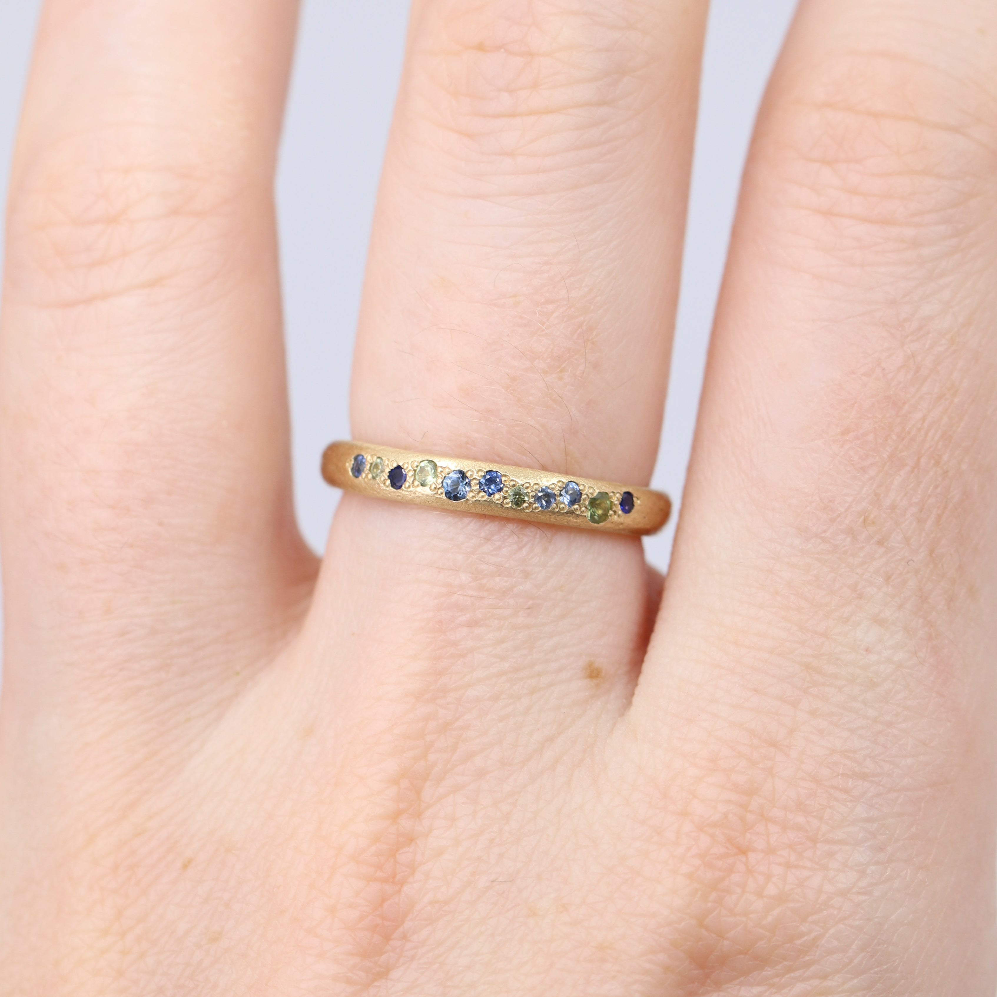 The Seafoam Scatter Band. Made in 9ct yellow gold scattered with blue and green sapphires. The Belle Smith Scatter Bands are hand-moulded using soft wax and an array of gemstones. Inspired by the beauty of nature, these handcrafted bands brings the organic growth of ivy and lichen to life. Gemstone patterns are carefully sketched to wrap gently around the band, creating the feeling of nature’s delicate vines intertwining with the metal. Each piece is then cast, with every detail thoughtfully placed to create a ring that feels both precious and timeless.