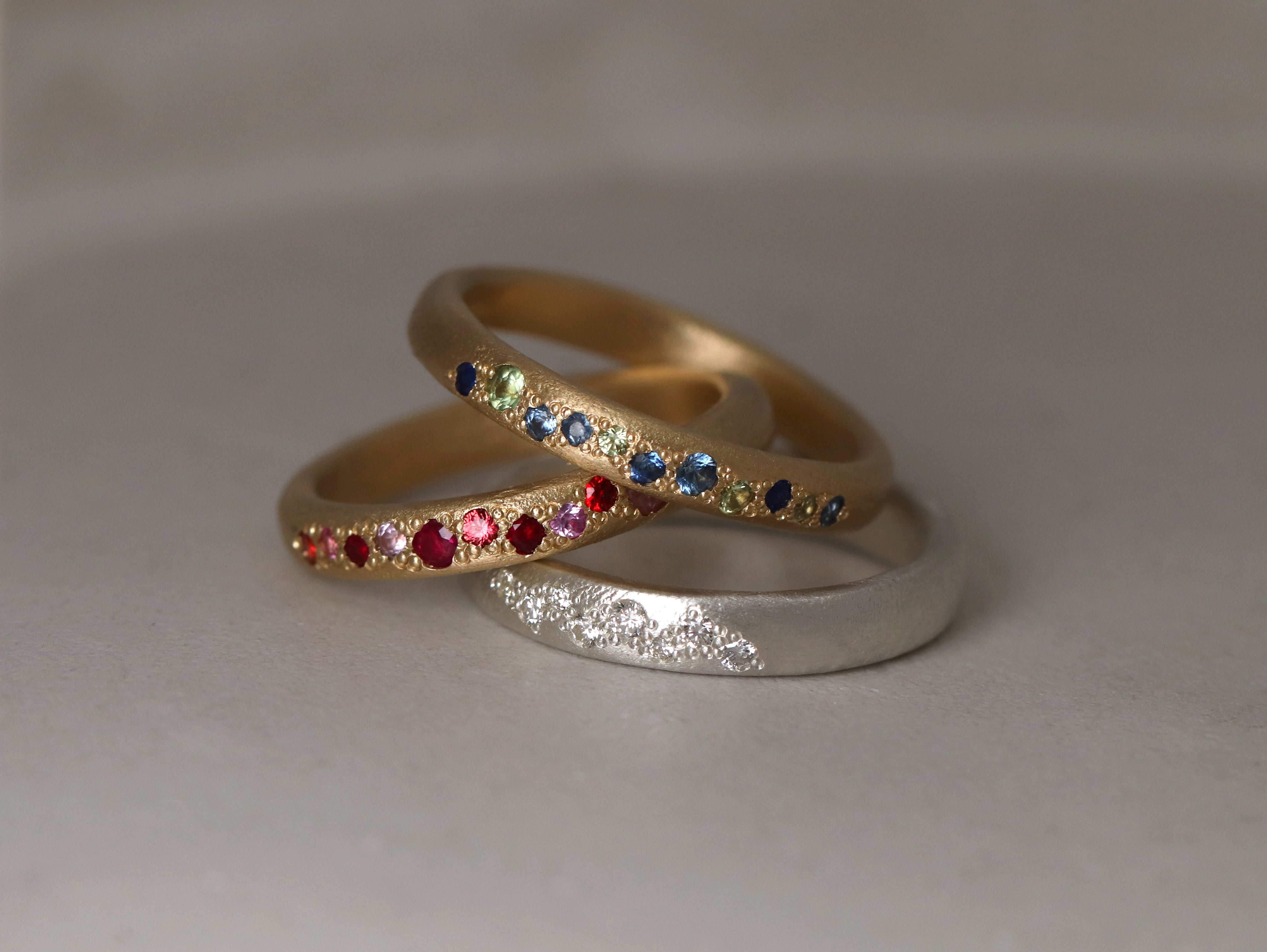 The Sherbet Scatter Band. Made in 9ct yellow gold scattered with sweet pink and purple sapphires and a couple of yellow diamonds. The Belle Smith Scatter Bands are hand-moulded using soft wax and an array of gemstones. Inspired by the beauty of nature, these handcrafted bands brings the organic growth of ivy and lichen to life. Gemstone patterns are carefully sketched to wrap gently around the band, creating the feeling of nature’s delicate vines intertwining with the metal. Each piece is then cast, with every detail thoughtfully placed to create a ring that feels both precious and timeless.