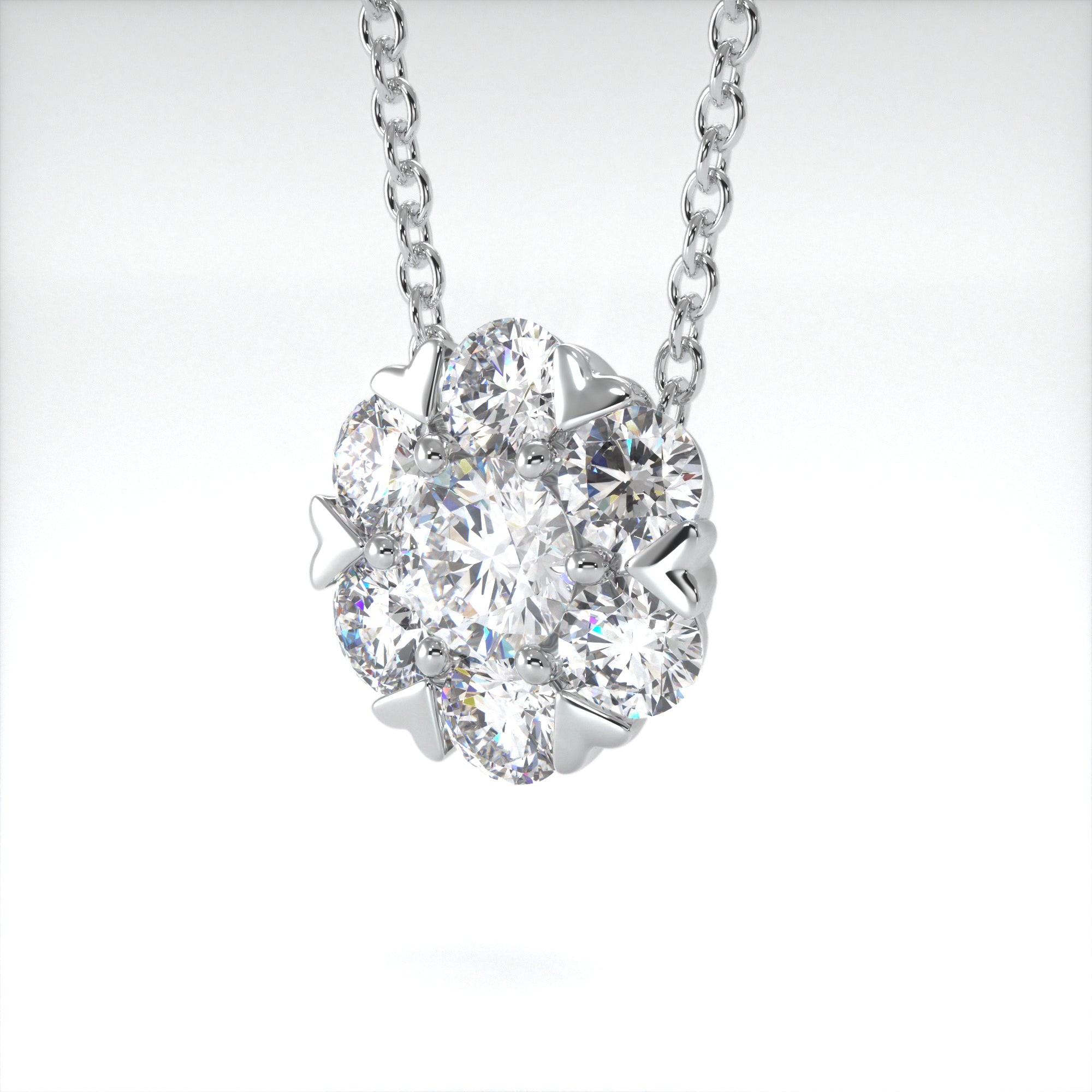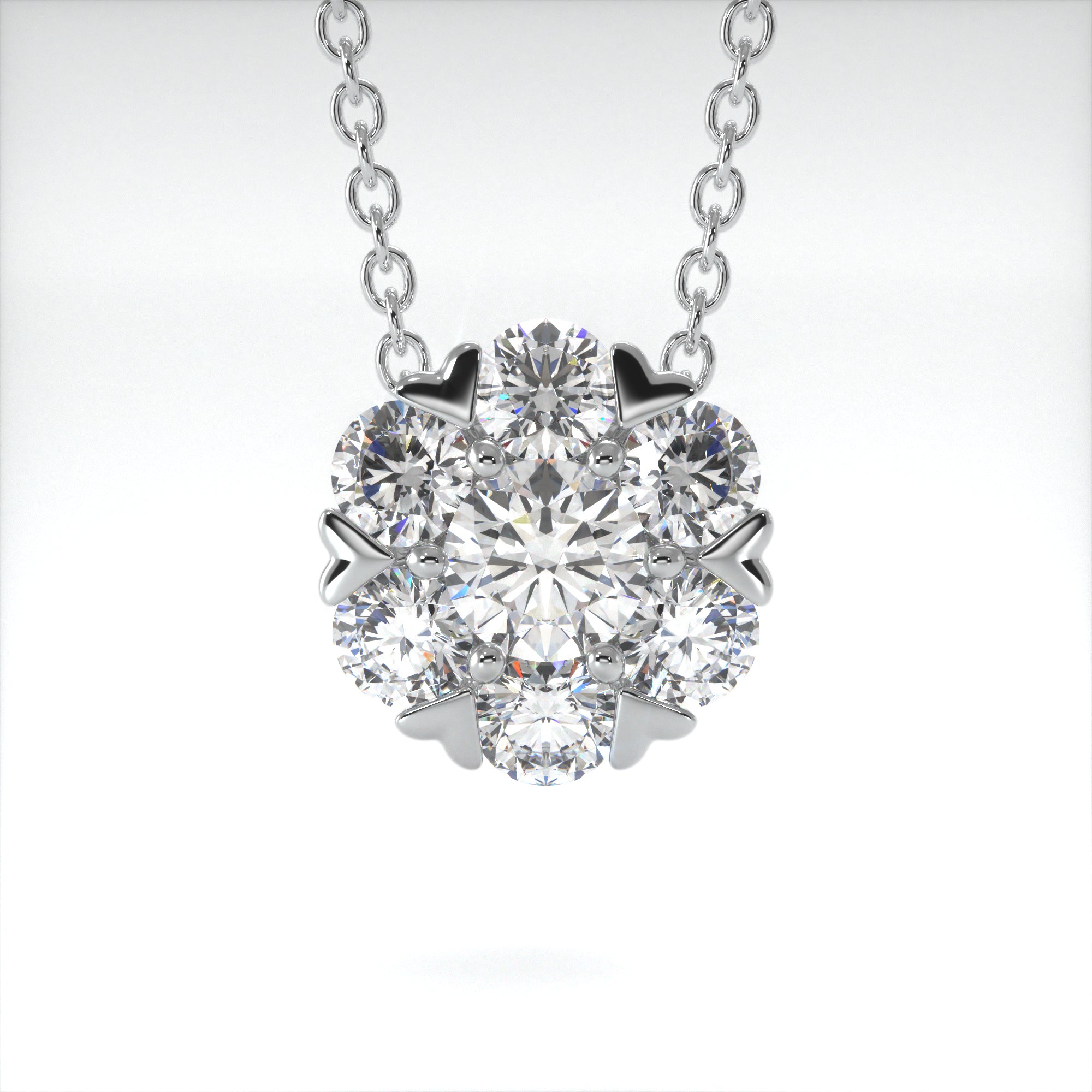 This stunning take on a classic floral cluster features delicate heart claws, encapsulating the stones perfectly. Featuring 0.90ct of Round Brilliant Diamonds and on a 16-18 inch adjustable trace chain, this pendant is gorgeous for a special occasion as well as dressing up your everyday.