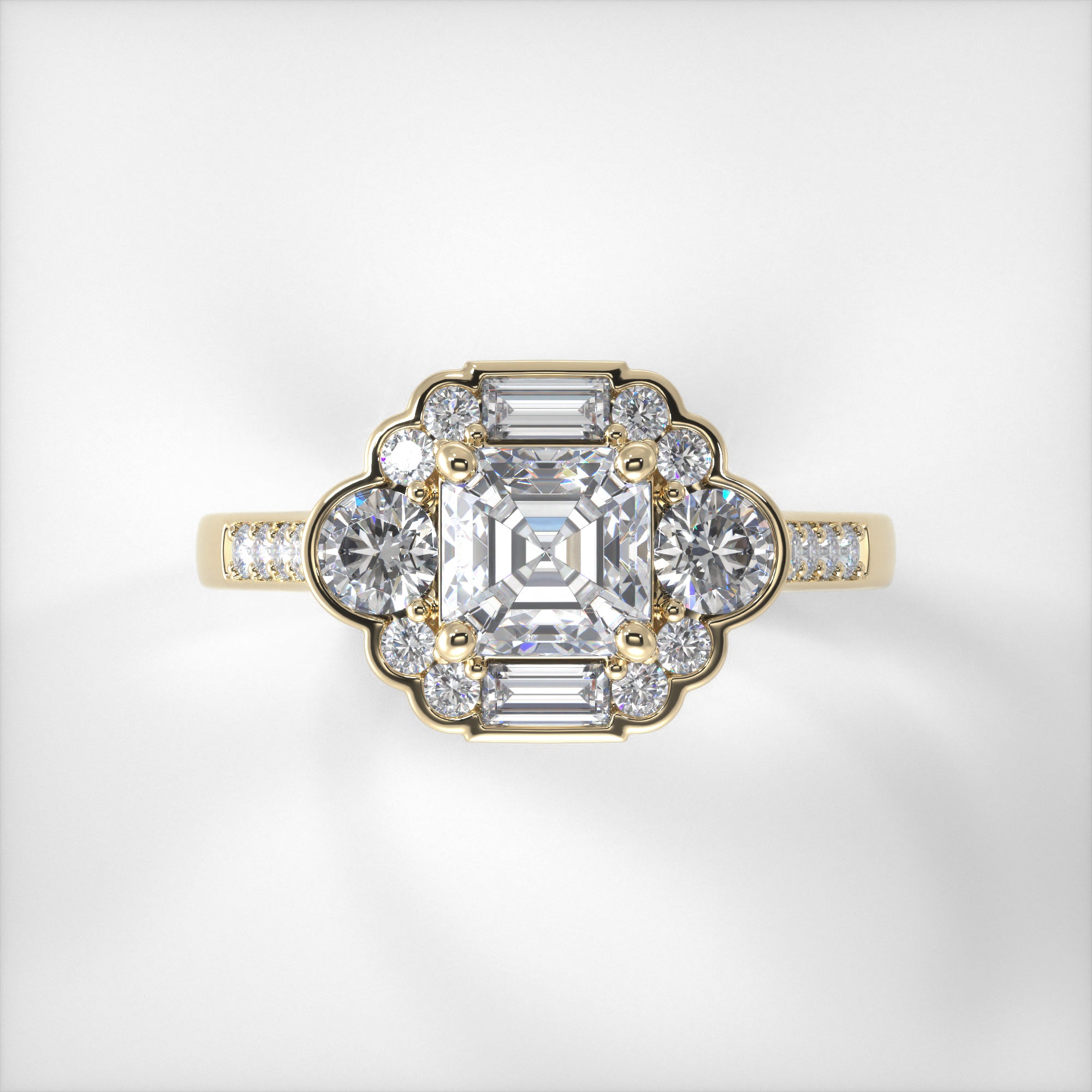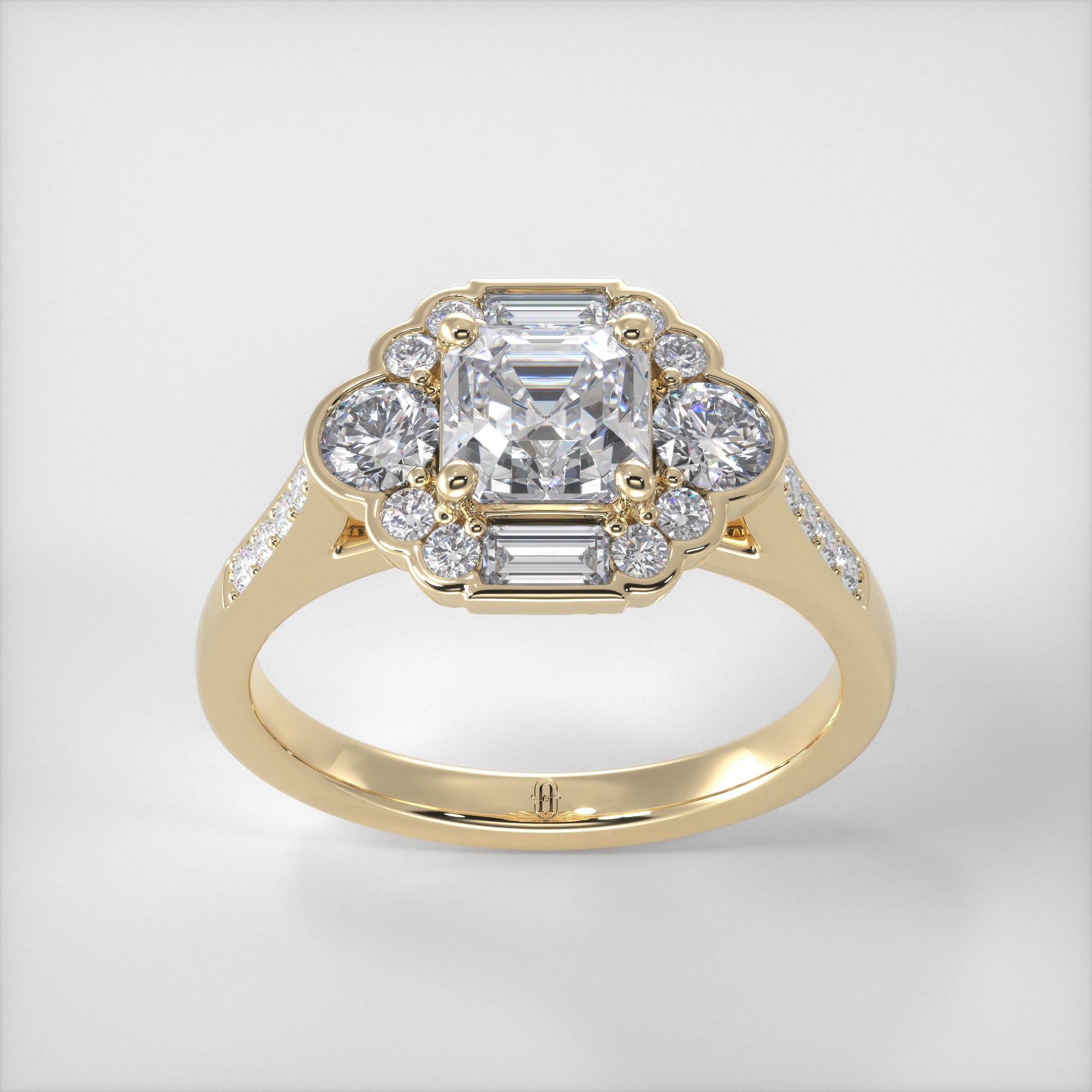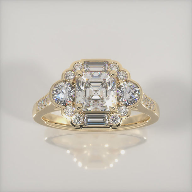 A dazzling ring with a beautiful Art Deco feel, the Tallulah is a favourite of the Alexandra Elizabeth team. Featuring an array of dazzling diamonds this piece has a total of 1.25ct made up of an Asscher, Baguettes and Round Brilliant Diamonds, covering the head and the shank of this ring. It is truly sparkling!