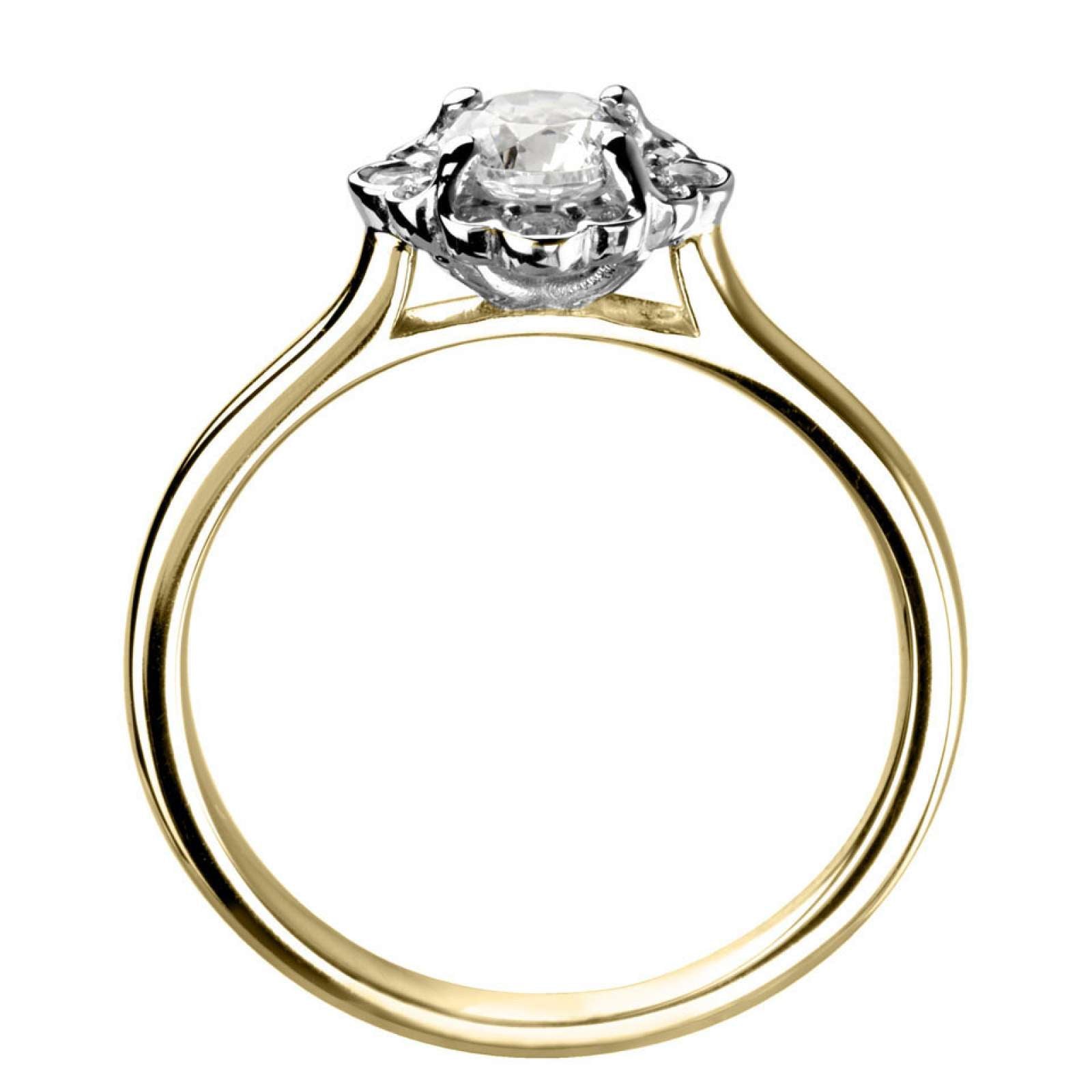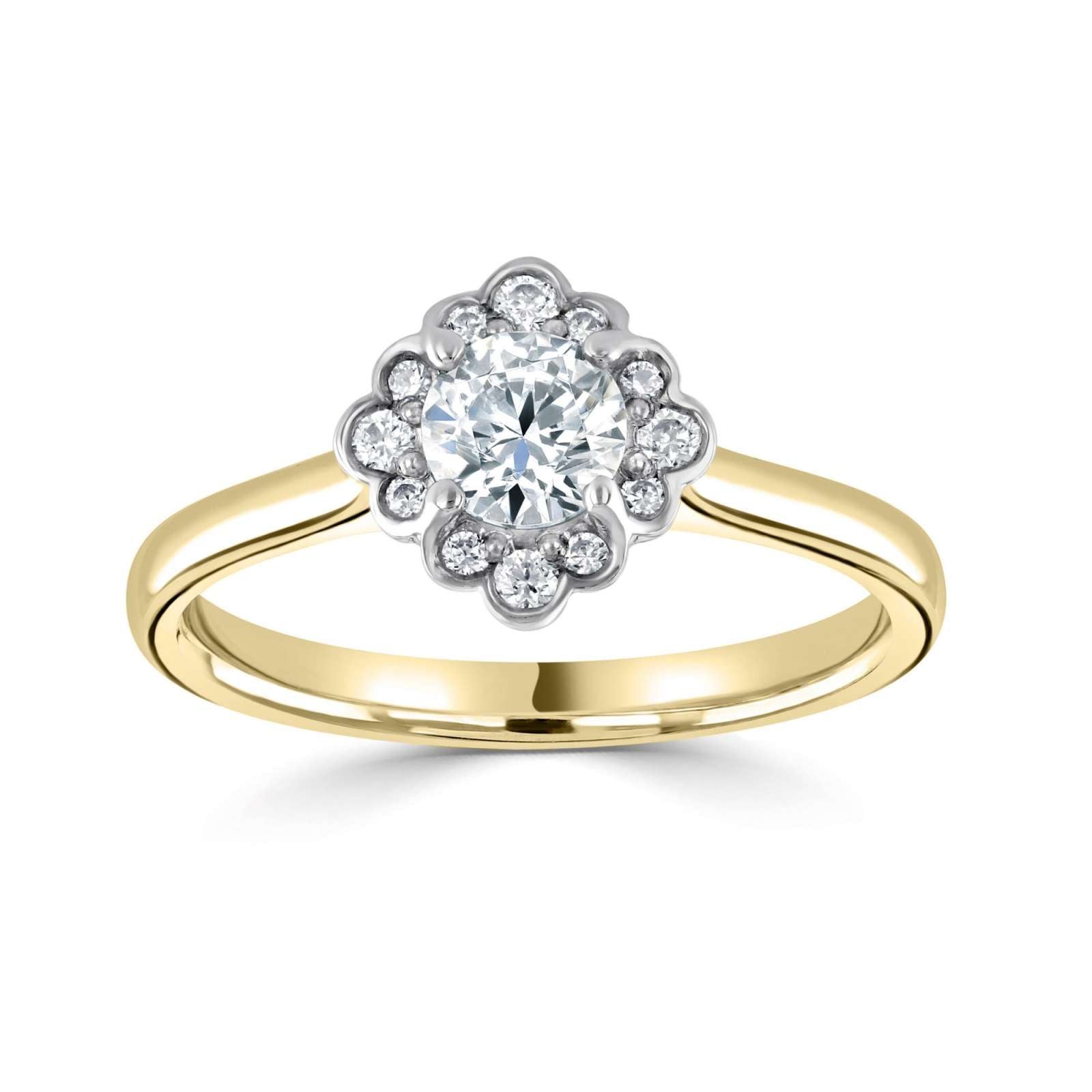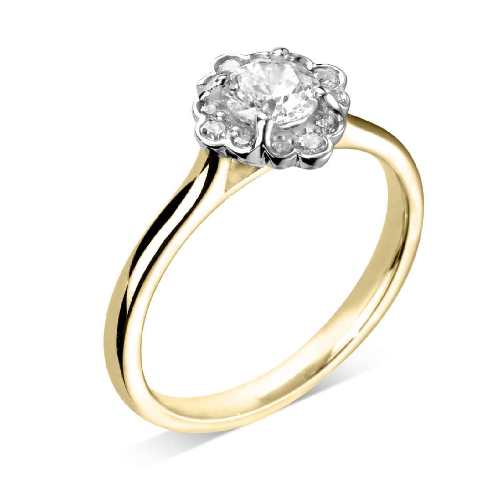 A scalloped edge halo with plain shoulders for a round centre stone. This is made from Platinum and 18ct Yellow Gold with a total stone carat weight of 0.34ct.