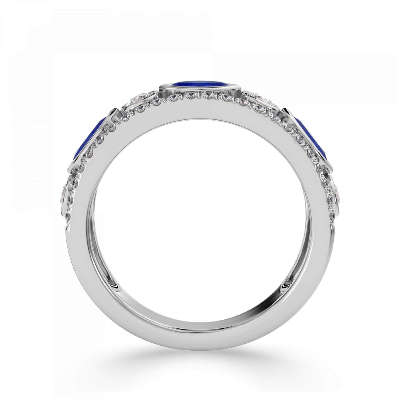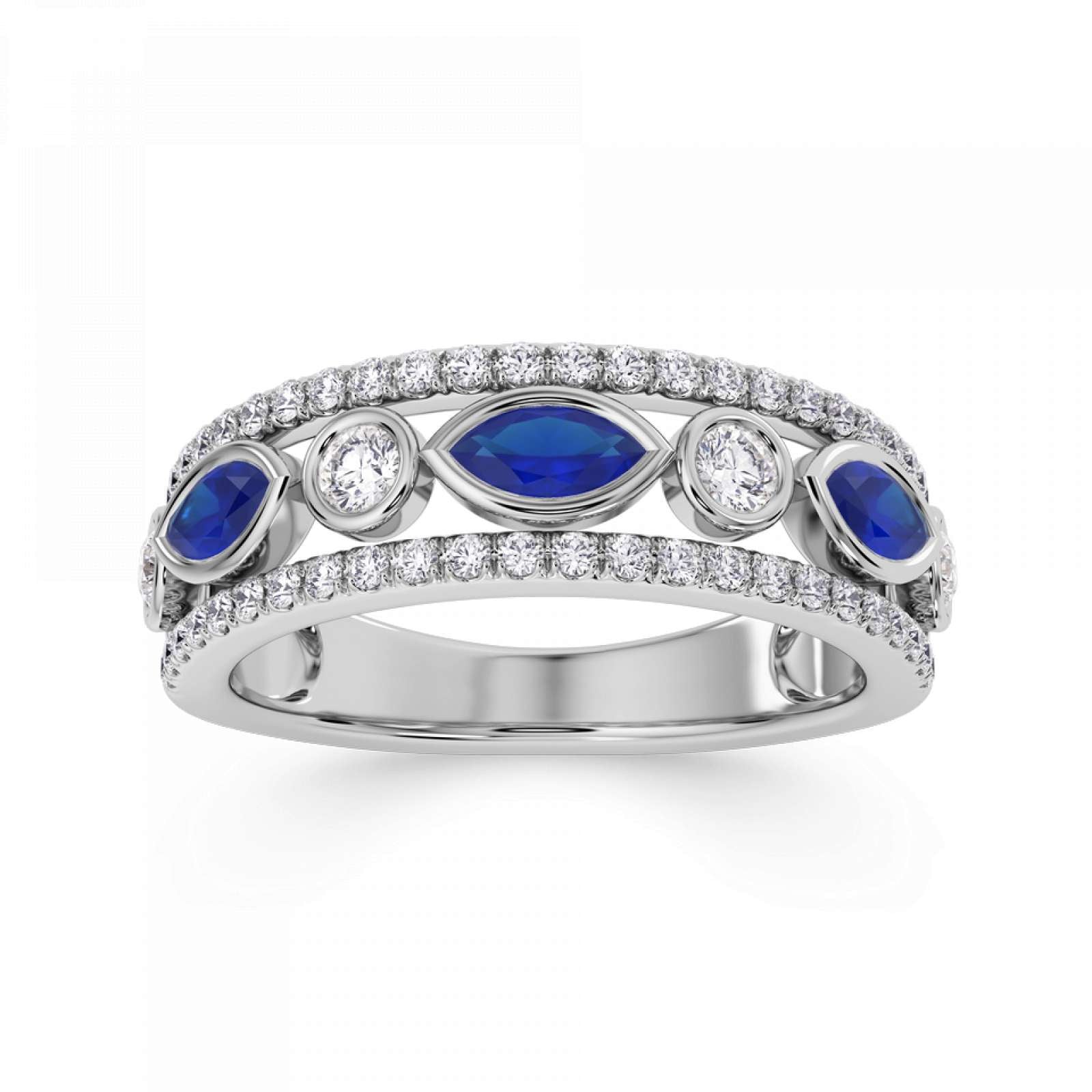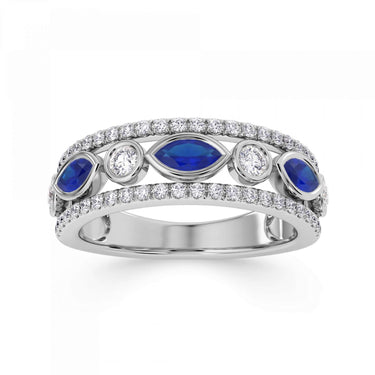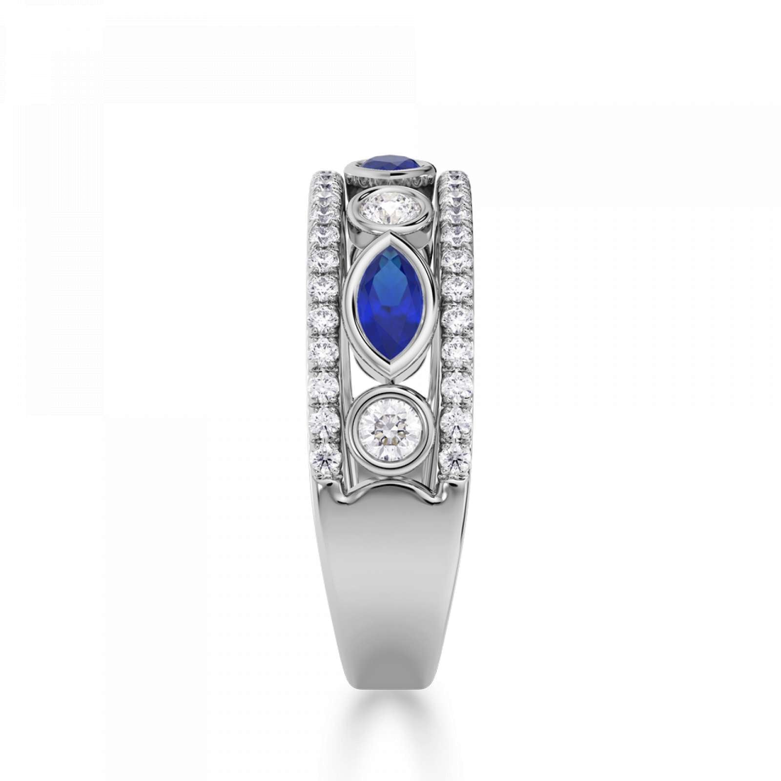 A statement diamond and gemstone ring featuring rubover set marquise and round stones. Available set with blue sapphire, emerald, or ruby. This design is beautifully crafted from Platinum.