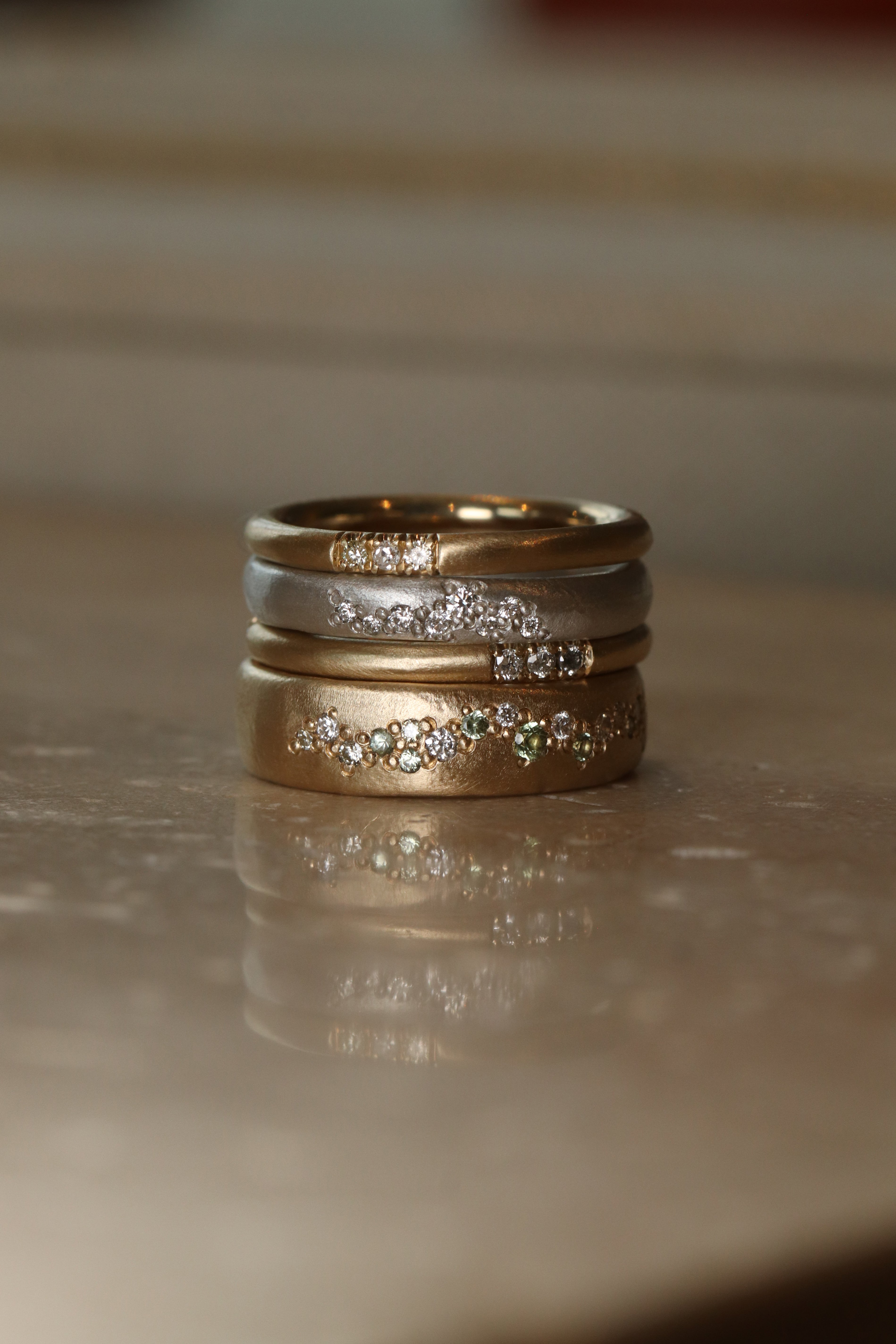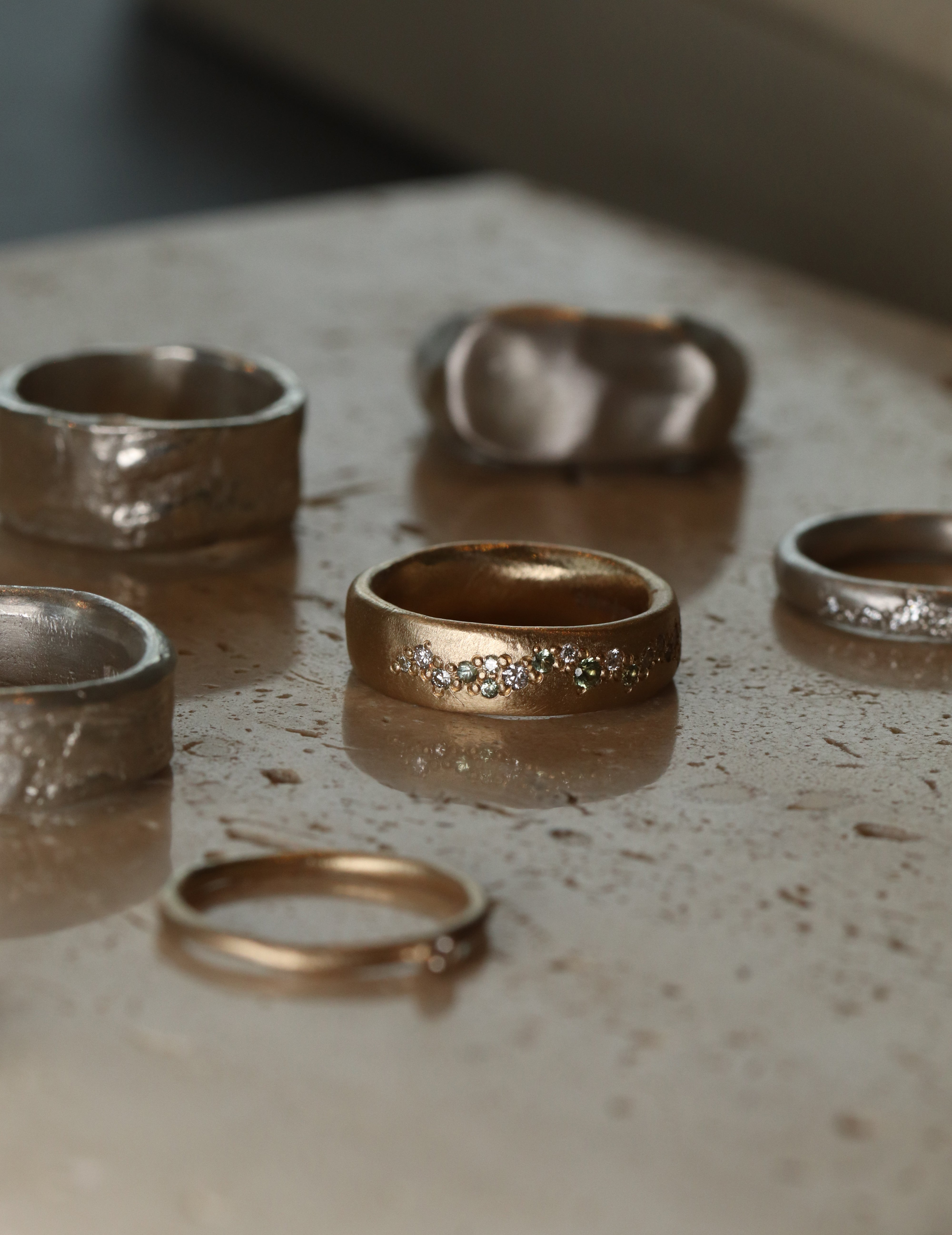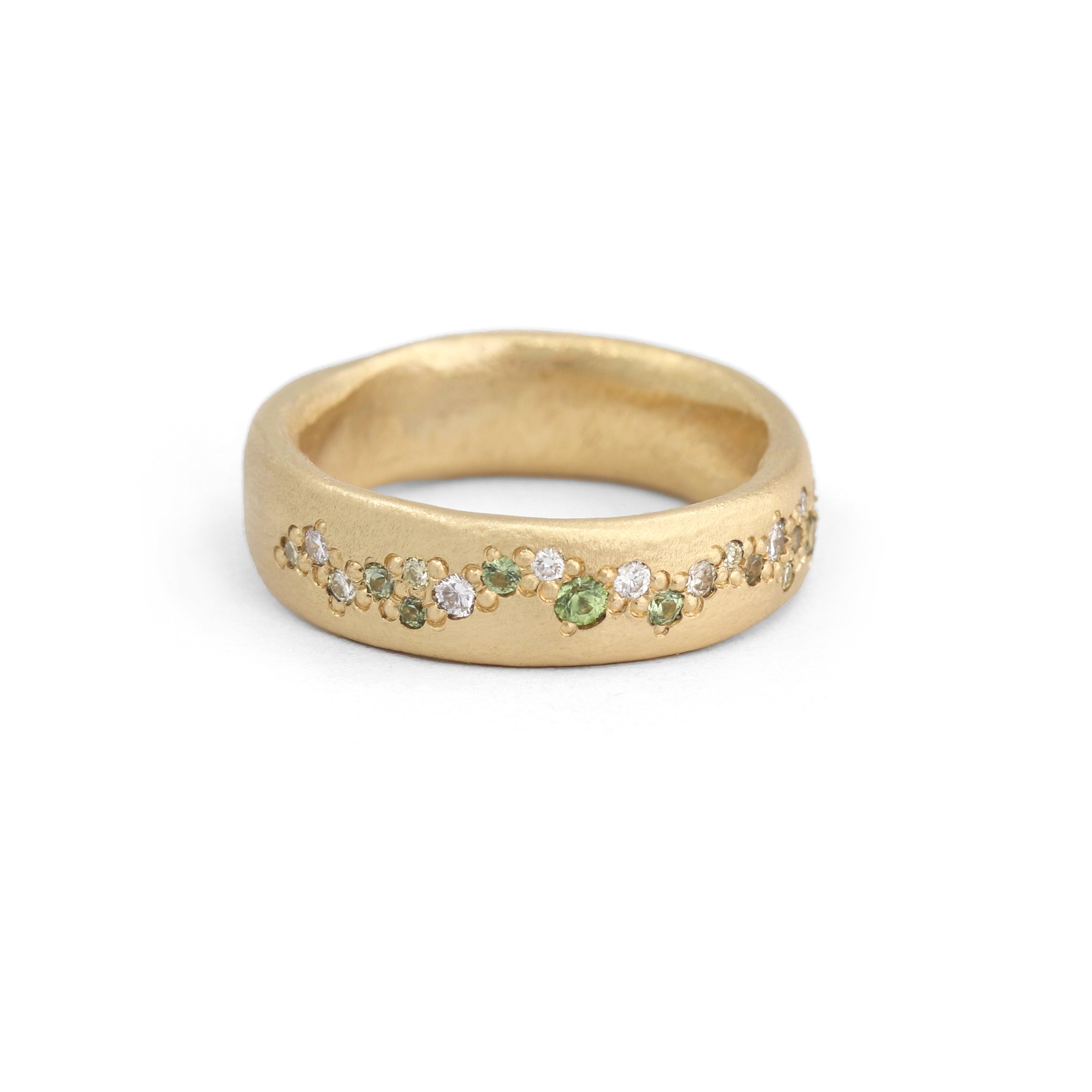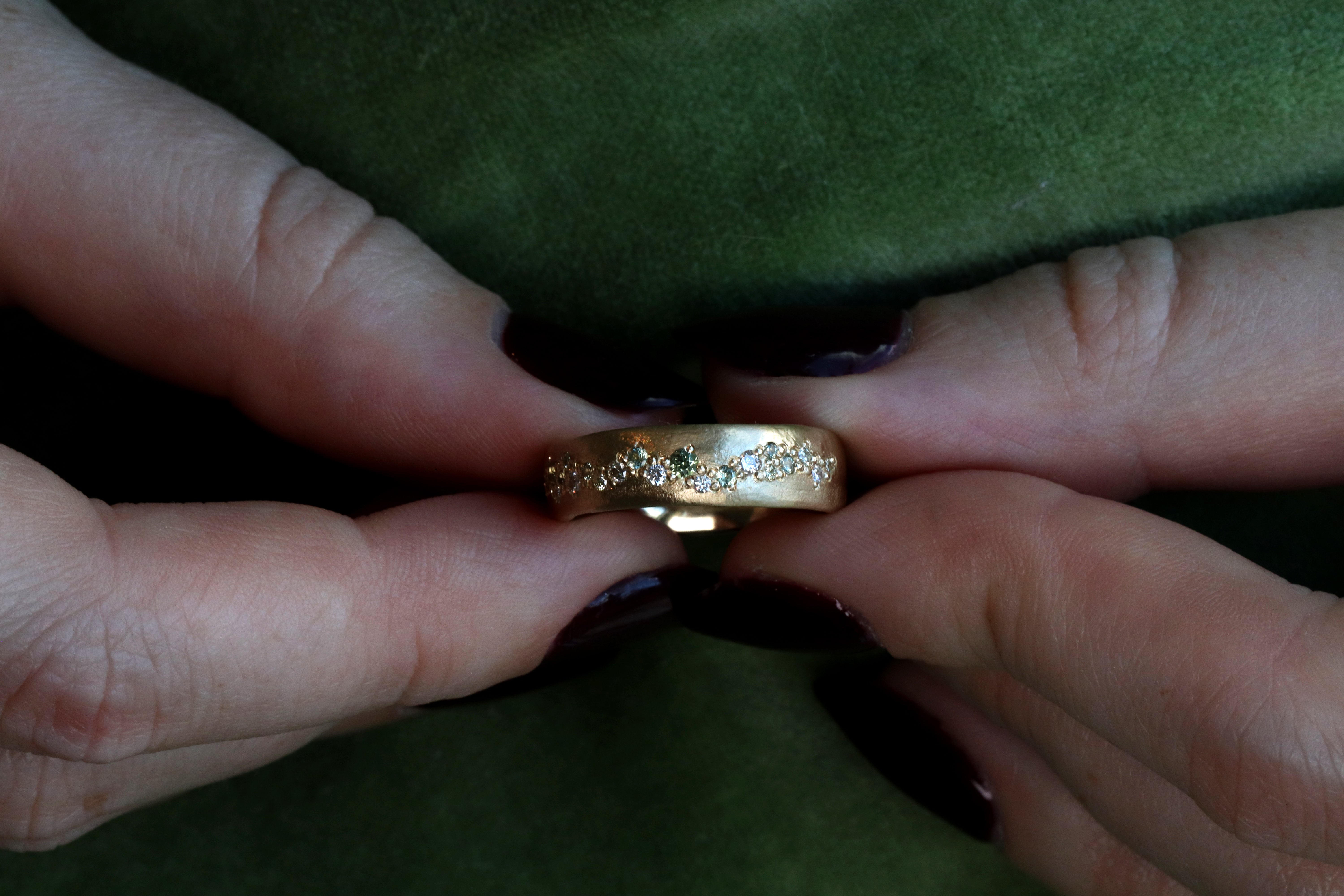 9ct yellow band with scattered white and champagne diamonds, and green sapphires. The Belle Smith Scatter Bands are hand-moulded using soft wax and an array of gemstones. Inspired by the beauty of nature, these handcrafted bands brings the organic growth of ivy and lichen to life. Gemstone patterns are carefully sketched to wrap gently around the band, creating the feeling of nature’s delicate vines intertwining with the metal. Each piece is then cast, with every detail thoughtfully placed to create a ring that feels both precious and timeless.
